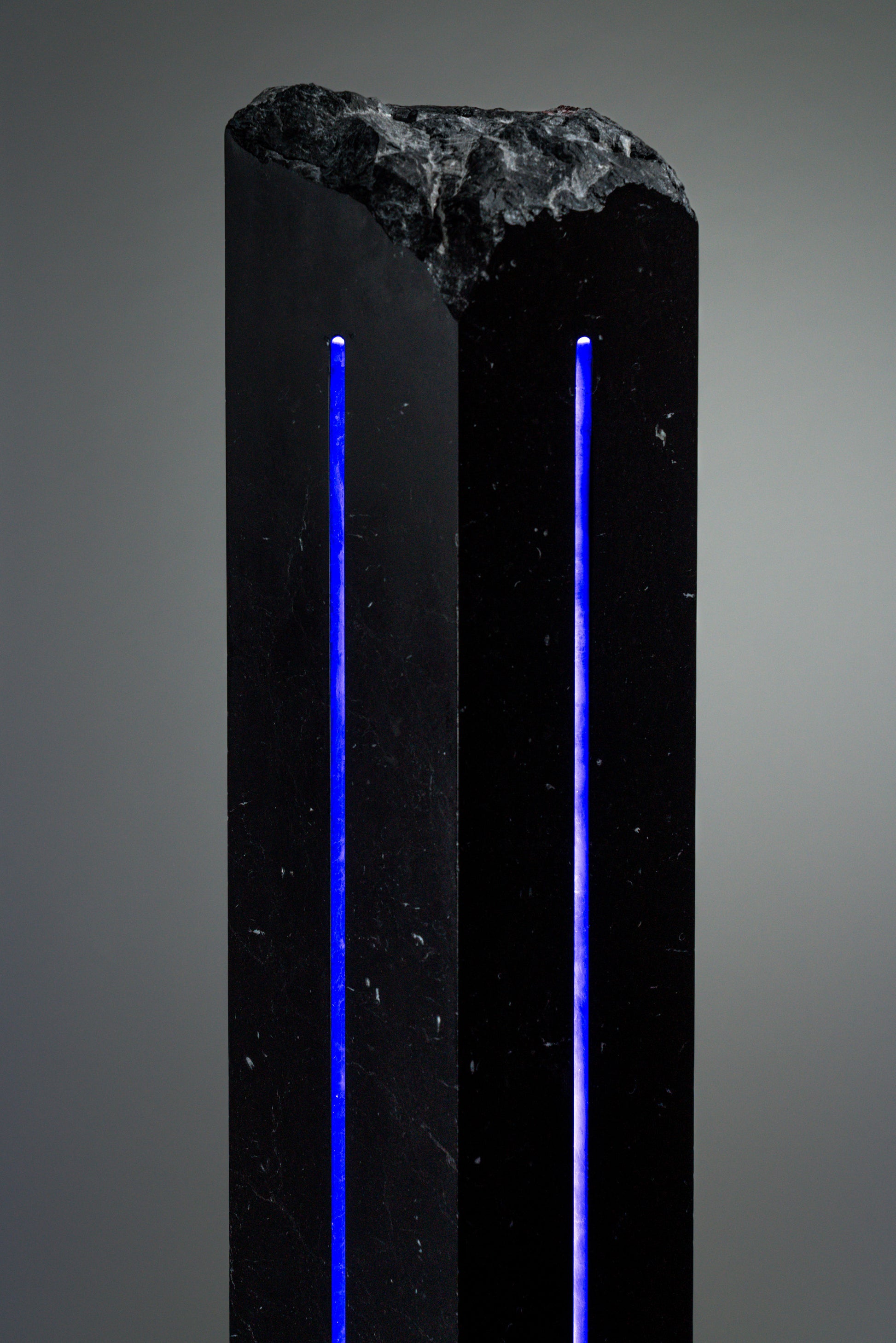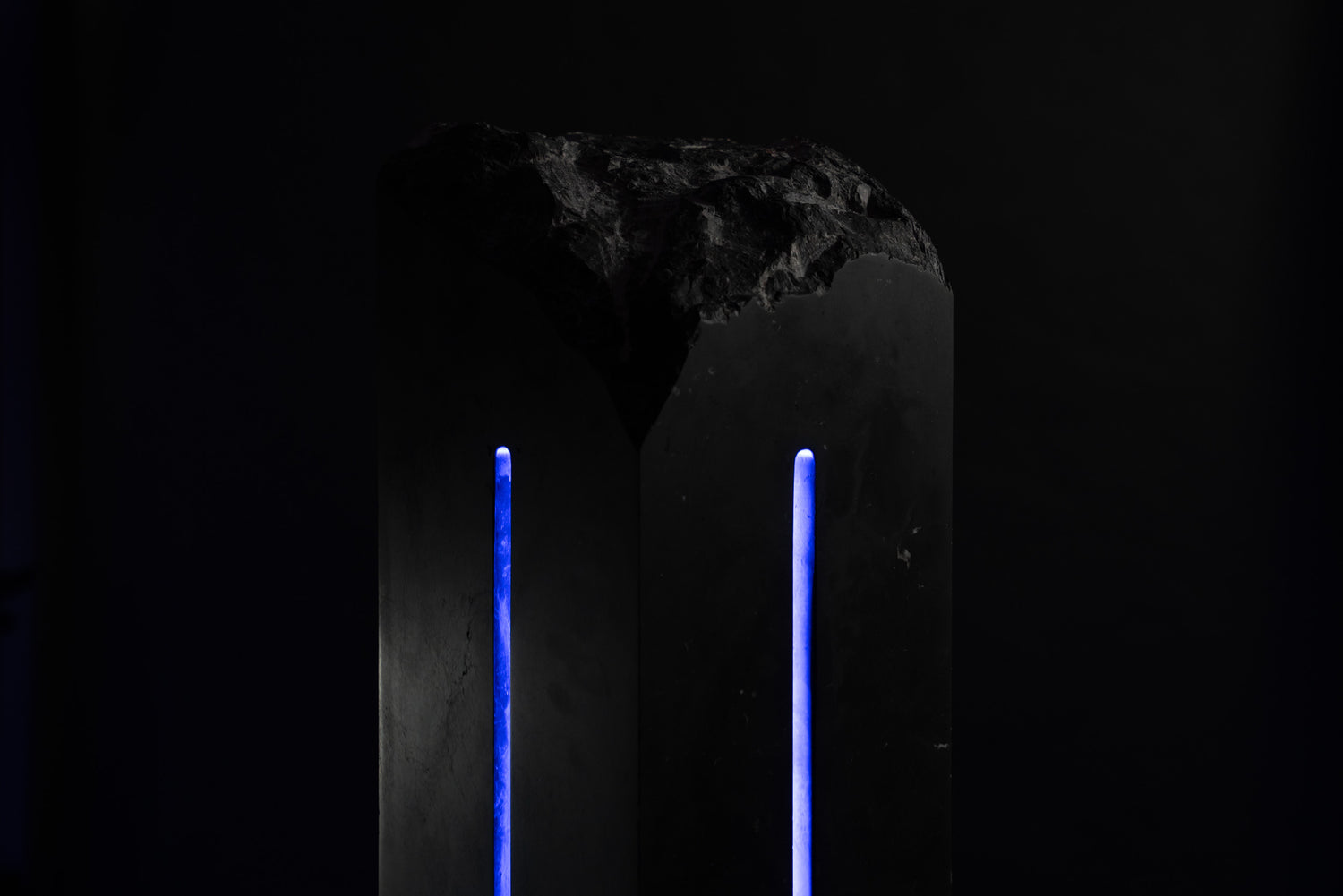 Asteria is carved from black marble, a material formed under immense pressure and time, its density absorbing light rather than reflecting it. The sculpture rises as a narrow, monolithic body—its sides polished into disciplined planes, its crown left fractured and unresolved, as though interrupted mid-formation.