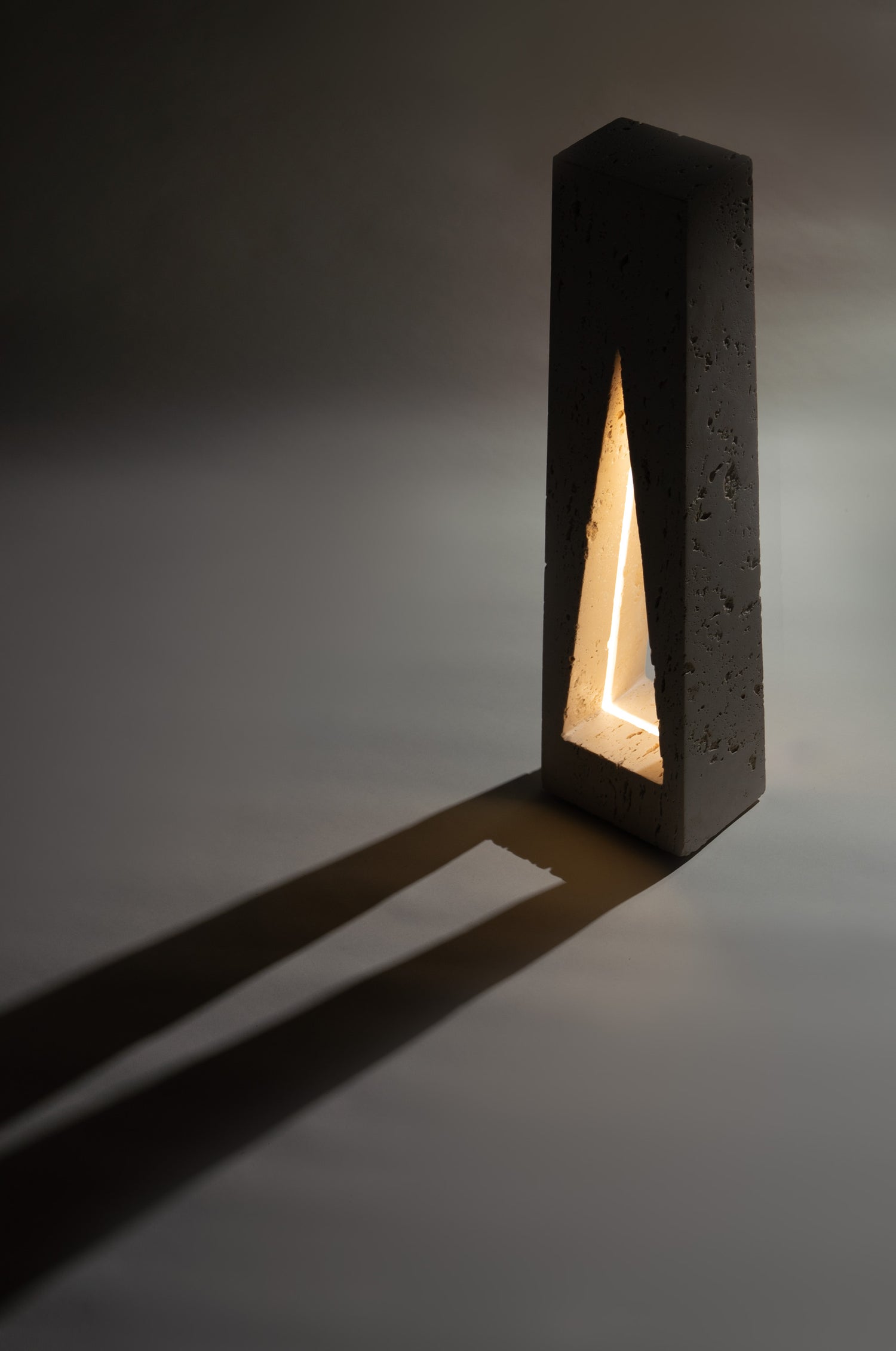 It is an exploration of both positive and negative spaces, embodying the concept of duality that is ever-present in our universe. This sculpture is a three-dimensional interpretation of a tapering trapezoid, intersecting the geometry of its triangular void. A bisecting vertical plane of light cuts through this form, embodying the constant interplay between solidity and void, presence and absence.