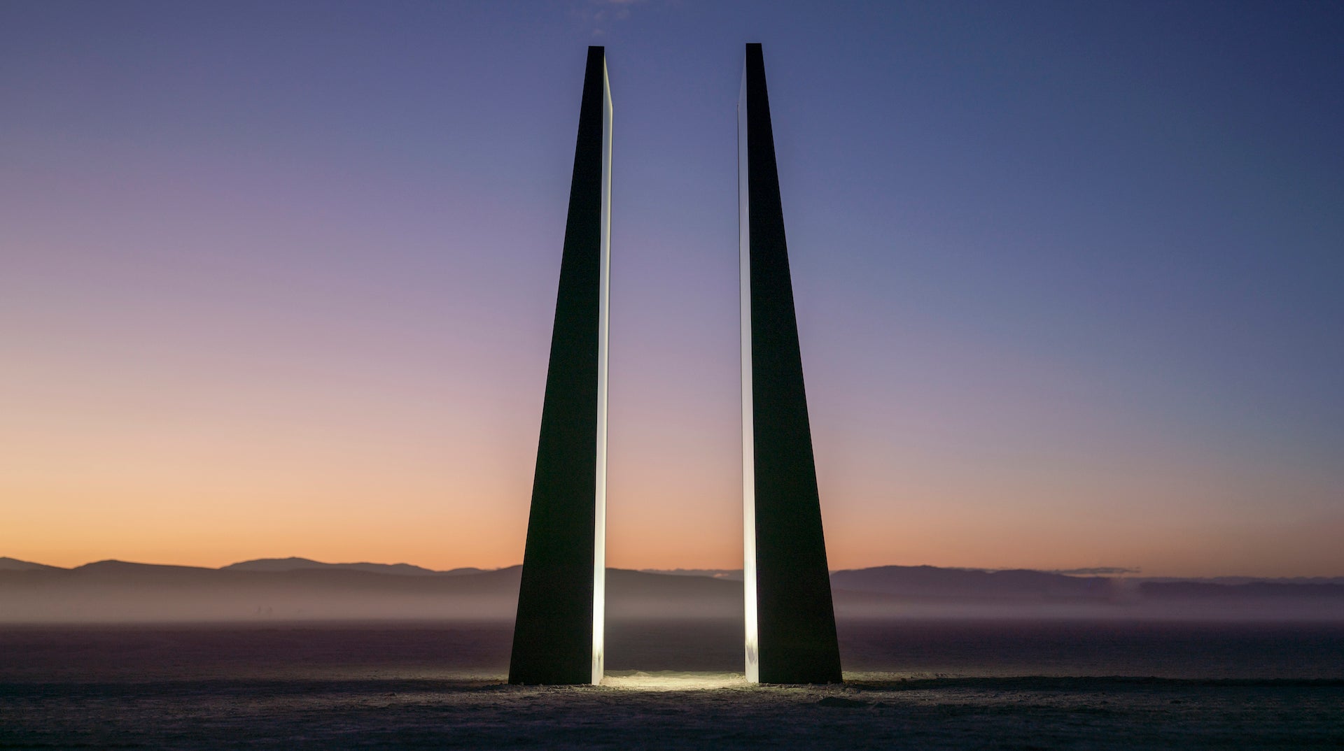 Titan’s ten-foot tall exterior is crafted from Zimbabwe black granite, one is of Earth’s darkest and oldest stones, contrasted with inner faces of custom acrylic with one-way mirror coating. The mirror becomes backlit as the sun sets, giving the work an ethereal nocturnal glow.